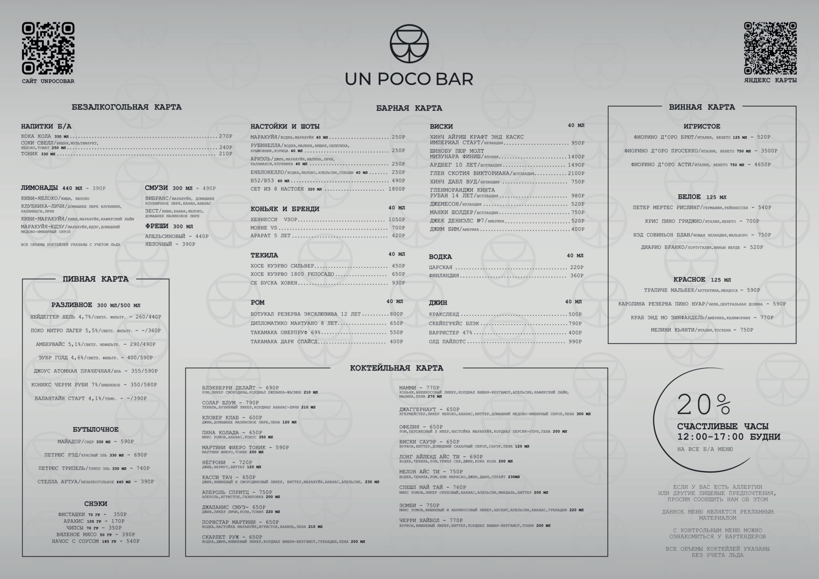 UN POCO BAR — это место, где стиль и вкус встречаются с легкостью и минимализмом. Это ваш оазис в центре городской суеты, где каждый коктейль рассказывает свою историю, а каждый вечер оставляет приятное послевкусие.