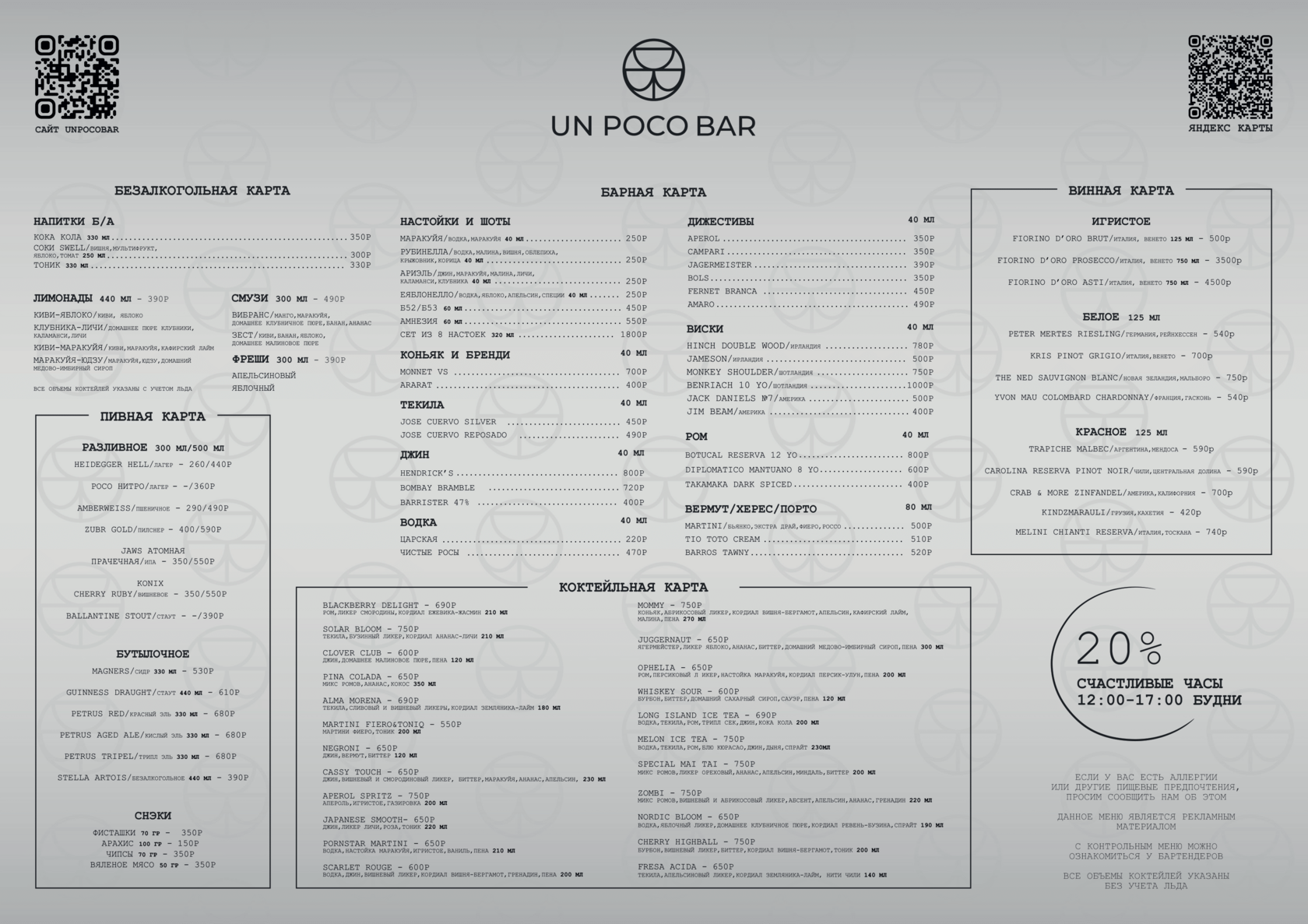 Приходите в UN POCO, чтобы провести незабываемый вечер, окунуться в атмосферу настоящего гостеприимства и насладиться великолепными коктейлями.